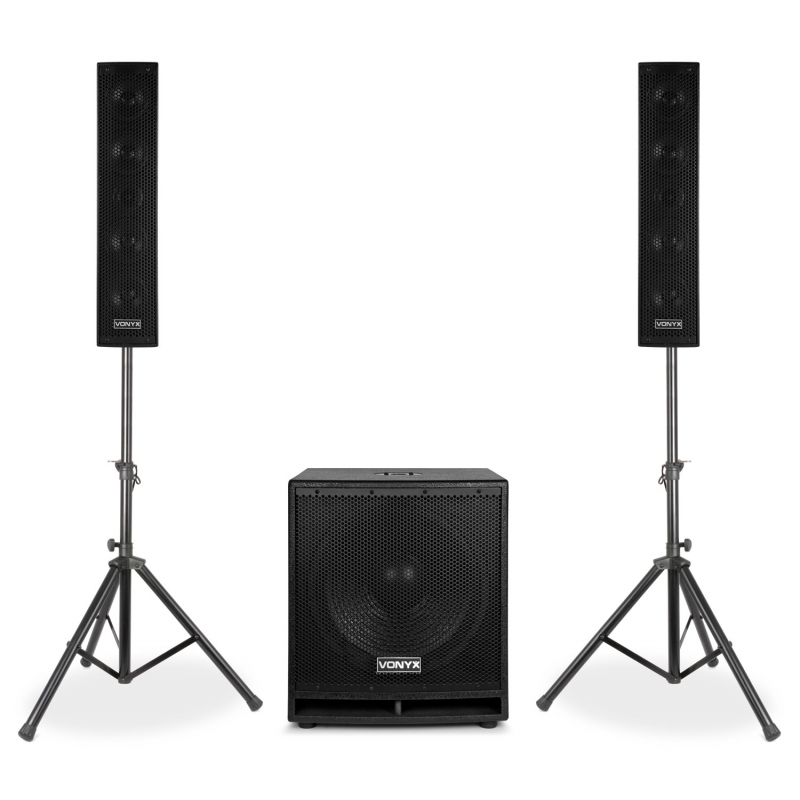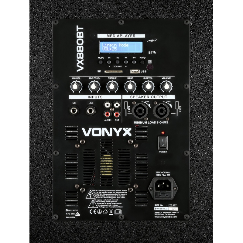 VX880BT rinkinį lengva nustatyti ir lengva transportuoti. Į šį rinkinį įeina 15 colių žemų dažnių garsiakalbis ir dvi 8 colių medinės kolonėlės. Abiejose kolonėlėse yra 4x 2,5 colių garsiakalbiai ir 1x 2,5 colių garsiakalbis. Integruotas BT imtuvas leidžia tiesiog transliuoti muziką belaidžiu būdu iš savo išmaniojo telefono arba galite naudoti integruotą MP3 grotuvą su USB ir SD lizdais. Šis aktyvių garsiakalbių rinkinys tinka mobiliesiems didžėjams, karaokės šou, suvažiavimams, pristatymams ir kt.