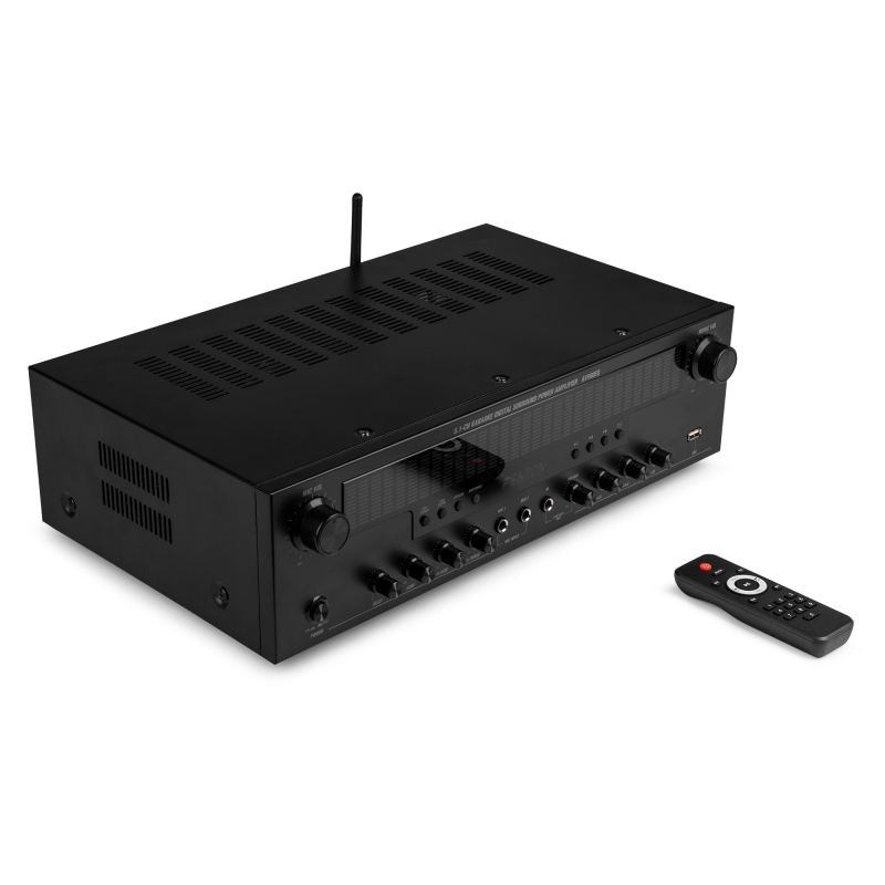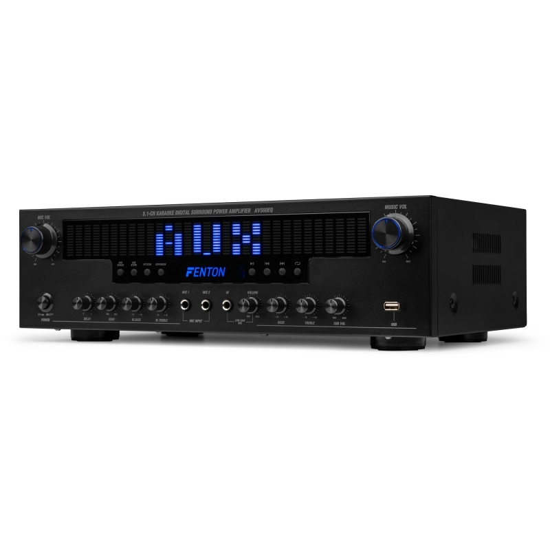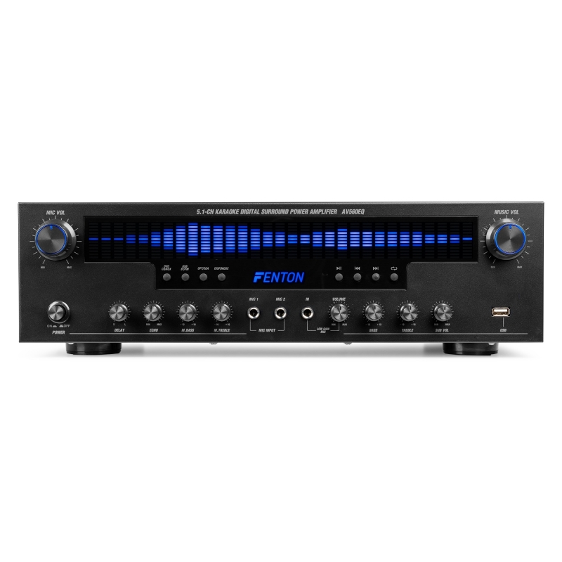 „AV560EQ“ – tai galingas 5.1 kanalo erdvinio garso stiprintuvas, sukurtas siekiant užtikrinti įtraukiantį garsą. Turėdami „Bluetooth“ ryšį, FM radijo imtuvą ir USB lizdą, galite lengvai mėgautis mėgstama muzika. Didelis, mėlynai apšviestas grafinis ekranas užtikrina stilingą ir įspūdingą išvaizdą. Idealiai tinkantis karaoke mėgėjams, „AV560EQ“ turi du priekinius mikrofono įėjimus su aido valdymu. Turėdamas penkis kanalus visiems garsiakalbiams ir žemųjų dažnių garsiakalbiui, keletą įėjimų ir išėjimų, šis stiprintuvas užtikrina galingą erdvinį garsą, nesvarbu, ar grojate takelius iš USB atmintinės, transliuojate per „Bluetooth“, ar klausotės FM radijo. 5.1 kanalo imtuvo sistema